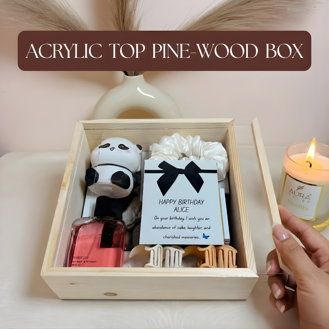 A premium pine-wood box with a clear acrylic lid — minimal, timeless, and made to be reused ♻️✨