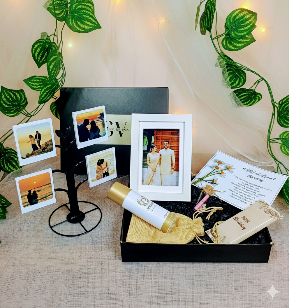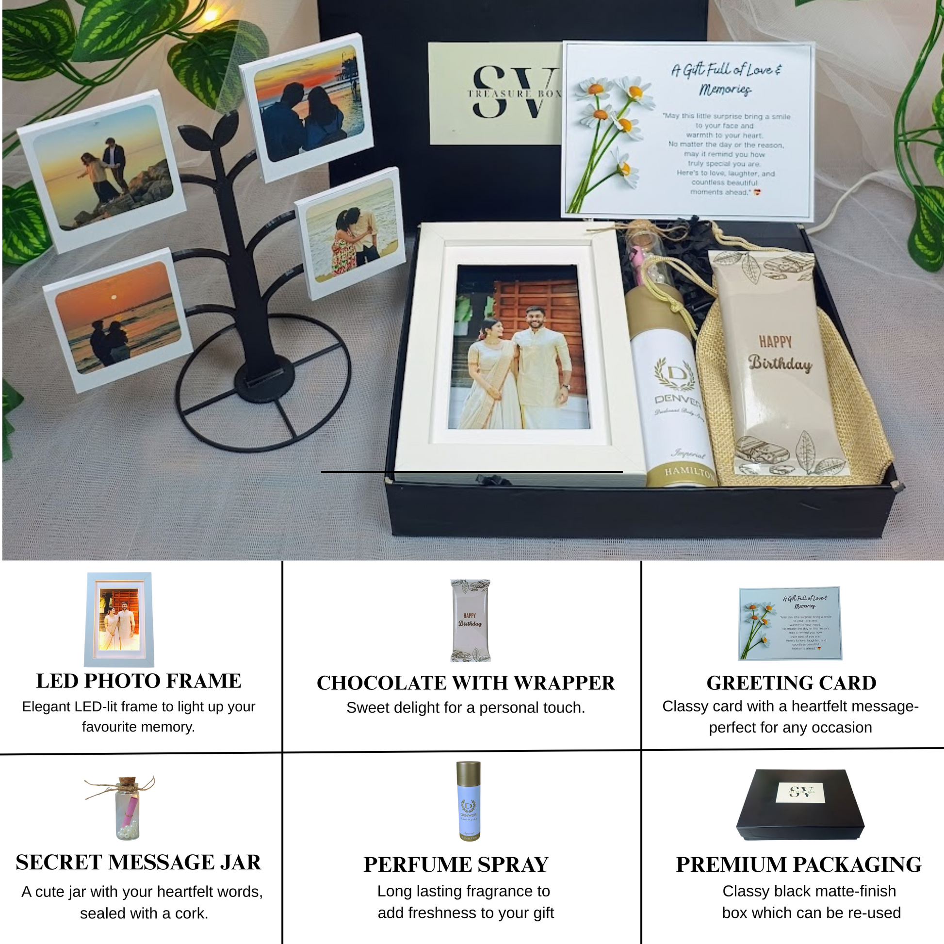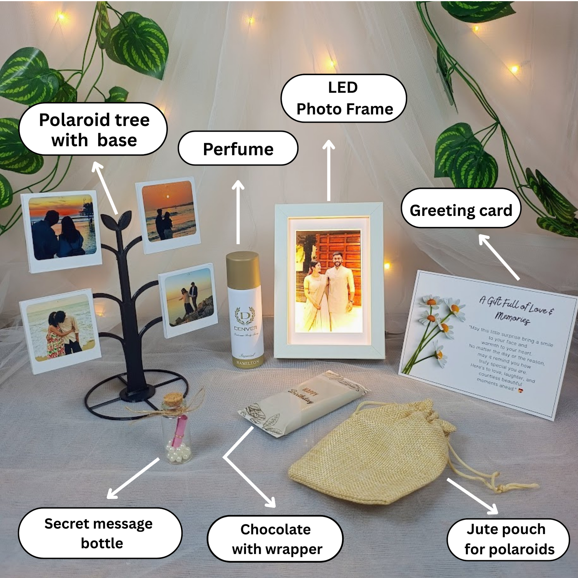 - COMPLETE GIFT SET: Premium hamper includes LED photo frame, Polaroid display tree, perfume, chocolate, greeting card and jute pouch, perfect for special occasions