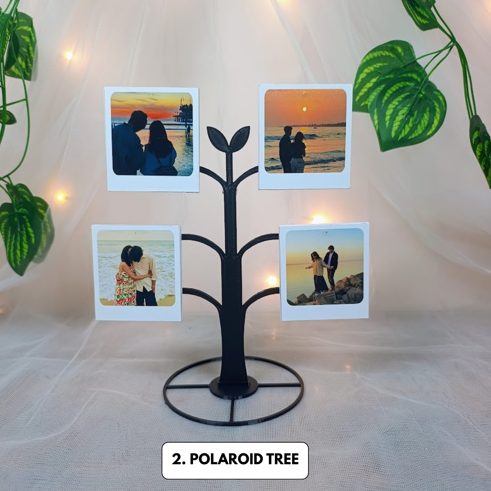 - PHOTO DISPLAY: Modern black tree-shaped stand with multiple slots for displaying cherished Polaroid photos, featuring LED illuminated frame